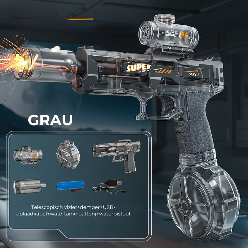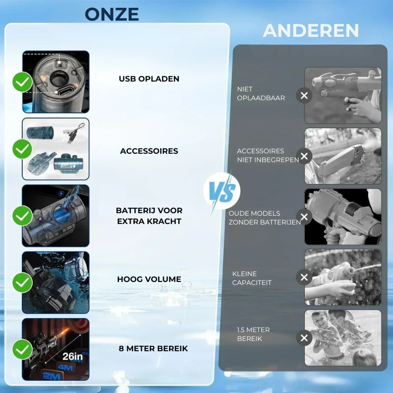 Het grote afvuurbereik van 8-10 meter helpt je het waterpistoolfeest te domineren!