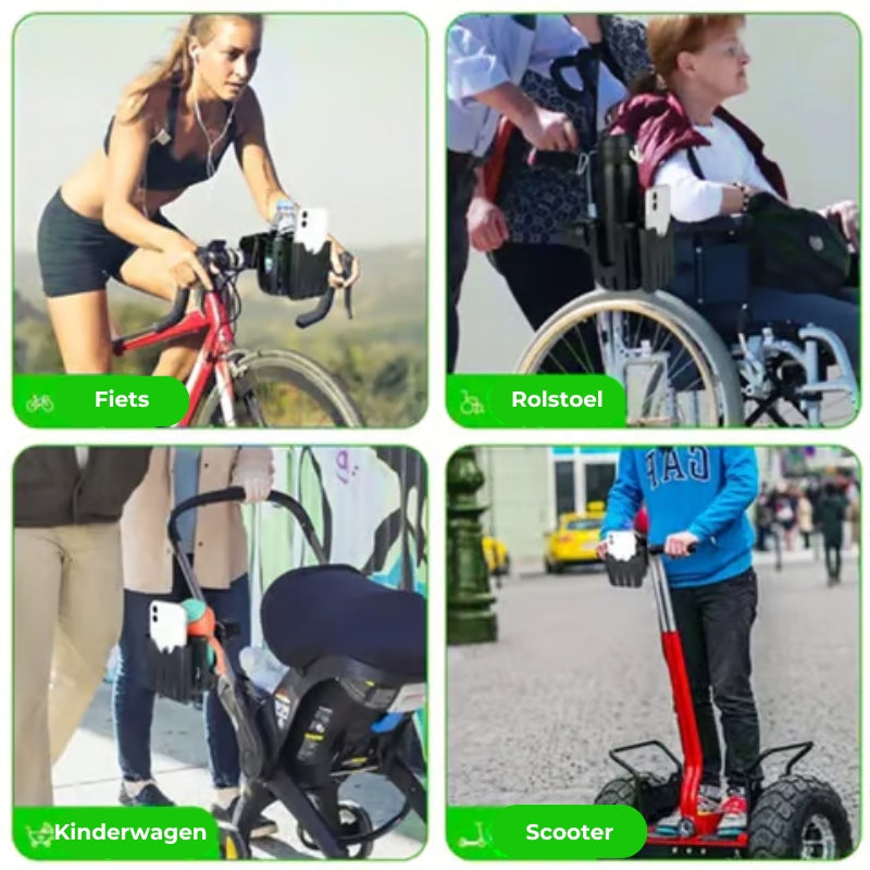 • Deze op de fiets monteerbare beker- en telefoonhouder past op de meeste sturen van fietsen, rollators, rolstoelen, buggy's, scooters, bootsturen, winkelwagentjes, kajaks, ATV's, motoren, loopbanden enz.